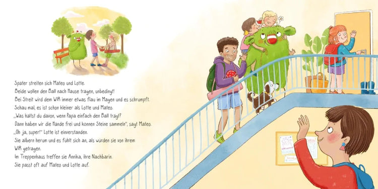 Mama und Papa suchen Hilfe bei der Trennungsberatung. Sie sorgen dafür, ihr WIR gut zu pflegen, damit das Familien-WIR der Grünlichs groß und stark bleibt. Und so sind die Grünlichs bald eine Familie mit zwei Wohnungen. Viele Dinge laufen nun anders, manches ist noch schwierig, aber die Chancen, dass bald alles gut ist, sind groß.