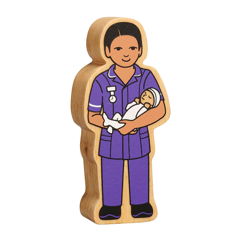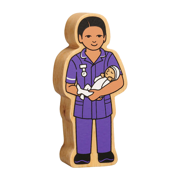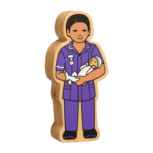 "Willkommen Baby"! Kinder können mit dieser Holzfigur, den Beruf der Hebamme nachahmen. Die Figur ist aus nachhaltigem Gummibaumholz, handgefertigt und beidseitig mit lilafarbenem Motiv bedruckt. Mit einer stabilen Dicke von 25 mm und abgerundeten Kanten liegt sie gut in kleinen Kinderhänden und eignet sich für Kinder ab 1 Jahr.