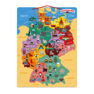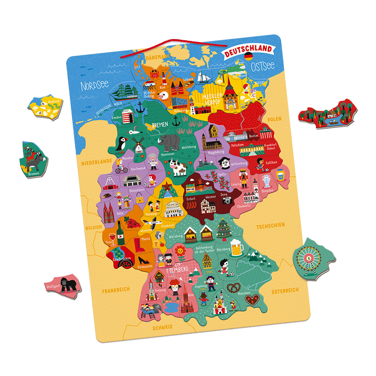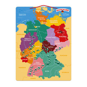 Geografie lernen und Spaß dabei haben! Die Magneten zeigen die Bundesländer sowie Abbildungen örtlicher Spezialitäten und bekannter Denkmäler. Die Länder sind anhand unterschiedlicher Farben zu unterscheiden. Auch die Meere, Ozeane, Inseln und Nachbarländer sind auf der Magnettafel abgebildet. Ordne die Magnete richtig an und freue dich auf die so entstehende, fantastische Deutschlandkarte, die du in deinem Zimmer aufhängen kannst! Mit 79 Magneten. Sprache : Deutsch.