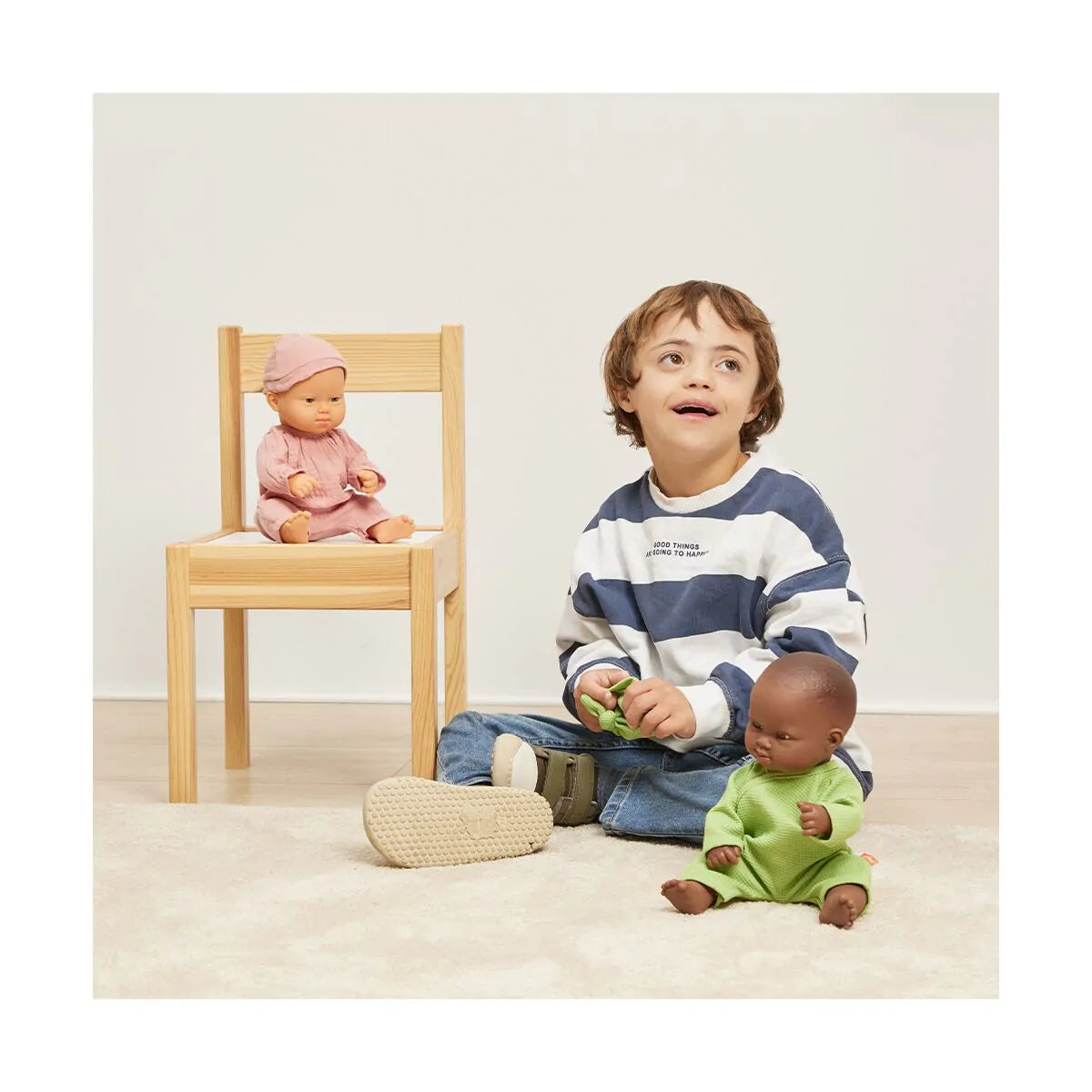 Weiße Babypuppe mit Downsyndrom